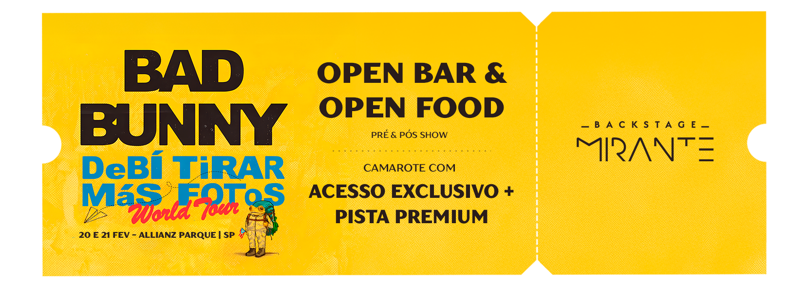 Com serviço premium de Open Bar e Open Food, acesso exclusivo ao melhor setor do show, e uma atmosfera vibrante que coloca você perto de seus artistas favoritos, o Backstage Mirante oferece uma experiência imersiva e extraordinária.